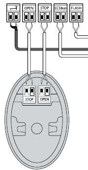 - Sluit de elektrische kabels aan op de juiste OPEN (OPEN) en STOP (STOP) aansluitingen zoals hieronder weergegeven. Het is niet nodig om een polariteit in acht te nemen. Om de bovenstaande handelingen te vergemakkelijken, kunt u de aansluitingen verwijderen, de verbindingen maken en vervolgens de aansluitingen terugplaatsen.