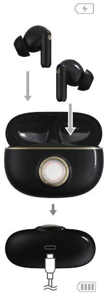 - Oordopjes in de case geplaatst en de case open houden. De LED's lichten één voor één op in een richting met de klok mee en geven vervolgens circulair weer.