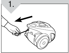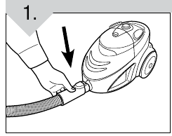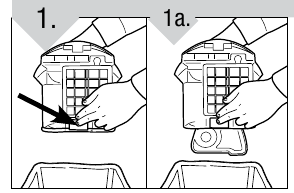 - Pak de handgreep vast en druk met uw duim op de knop (Diagram 1). Til het stofreservoir omhoog en uit, terwijl u de handgreep vasthoudt en op de knop drukt (Diagram 1a).