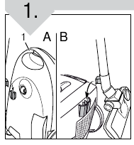 Duw de telescopische ontgrendelingsknop omlaag en schuif de buis tegelijkertijd in de onderste helft. Om de cilindervormige stofzuiger te transporteren, kunt u deze aan de draagbeugel (A,1) dragen. Wanneer u uw werk onderbreekt, gebruikt u de parkeerhaak in de parkeerbeugel (B). Om uw apparaat op te bergen, haakt u de opberghaak aan de opbergbeugel.