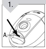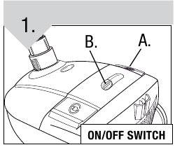 - Zet de stroom aan (ON/OFF switch (Aan/Uit-schakelaar) op de behuizing van de stofzuiger)(A).