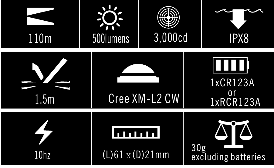 Output & Runtime: 3V 1500mAh CR123A(Compatible 3.7v 650mAh RCR123A)