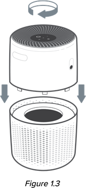 - Plaats de bovenste helft van de luchtzuiveraar direct terug op de onderste helft van de luchtzuiveraar. Draai met de klok mee om beide helften vast te zetten. [Afbeelding 1.3]