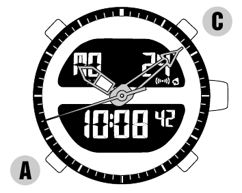 - Het starten en stoppen van de chronograaf kan worden herhaald door op knop C te drukken.