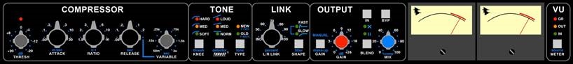 Een TYPE-schakelaar waarmee u kunt kiezen tussen klassieke en moderne compressiekenmerken: OLD voor vintage-achtige feedbackcompressie en NEW voor de meer gangbare feed-forwardcompressie van vandaag.