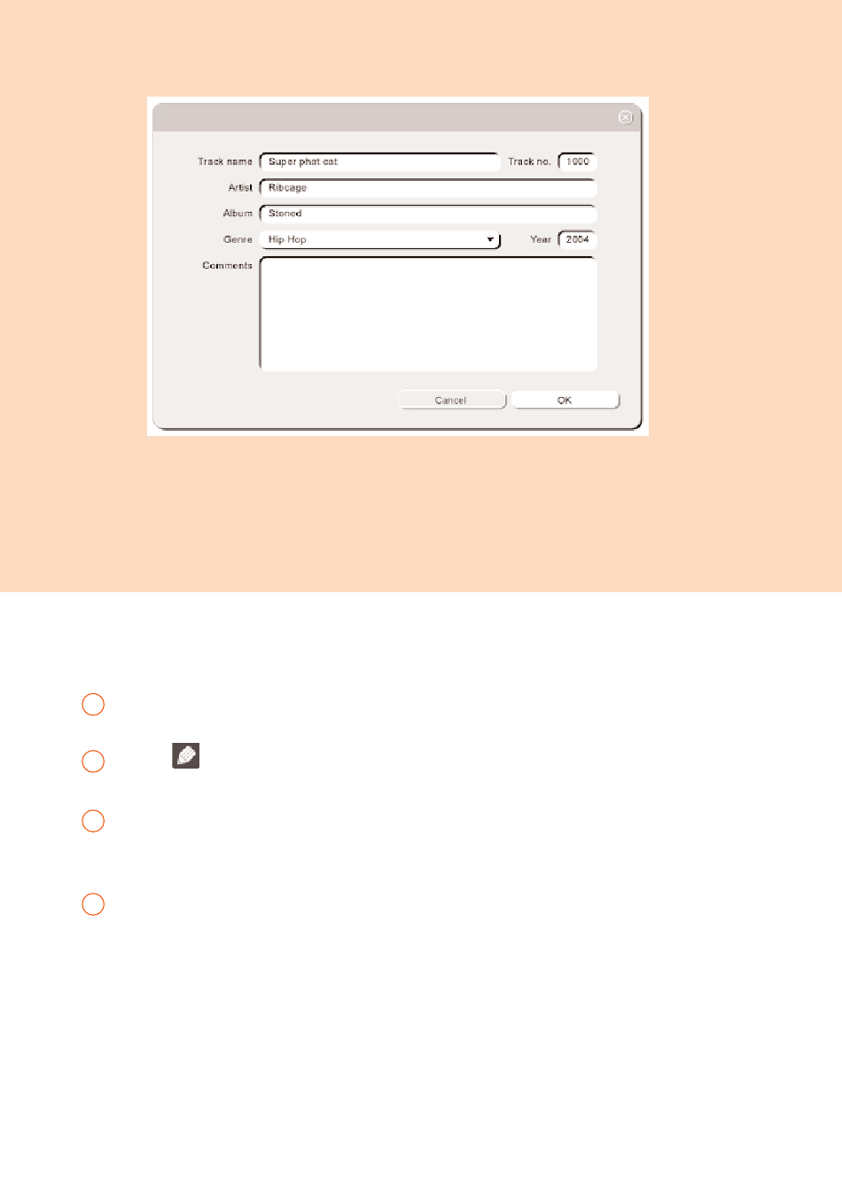 Klik op de tekstvakken bij T T r r a a c c k k n n a a m m e e (Tracknaam), T T r r a a c c k k n n u u m m b b e e r r (Tracknummer),